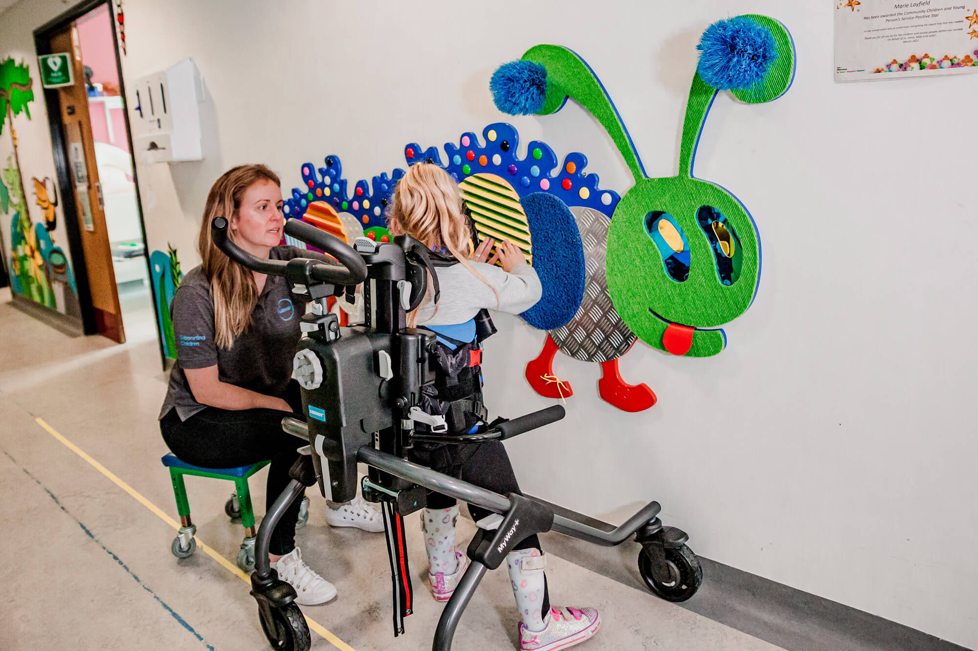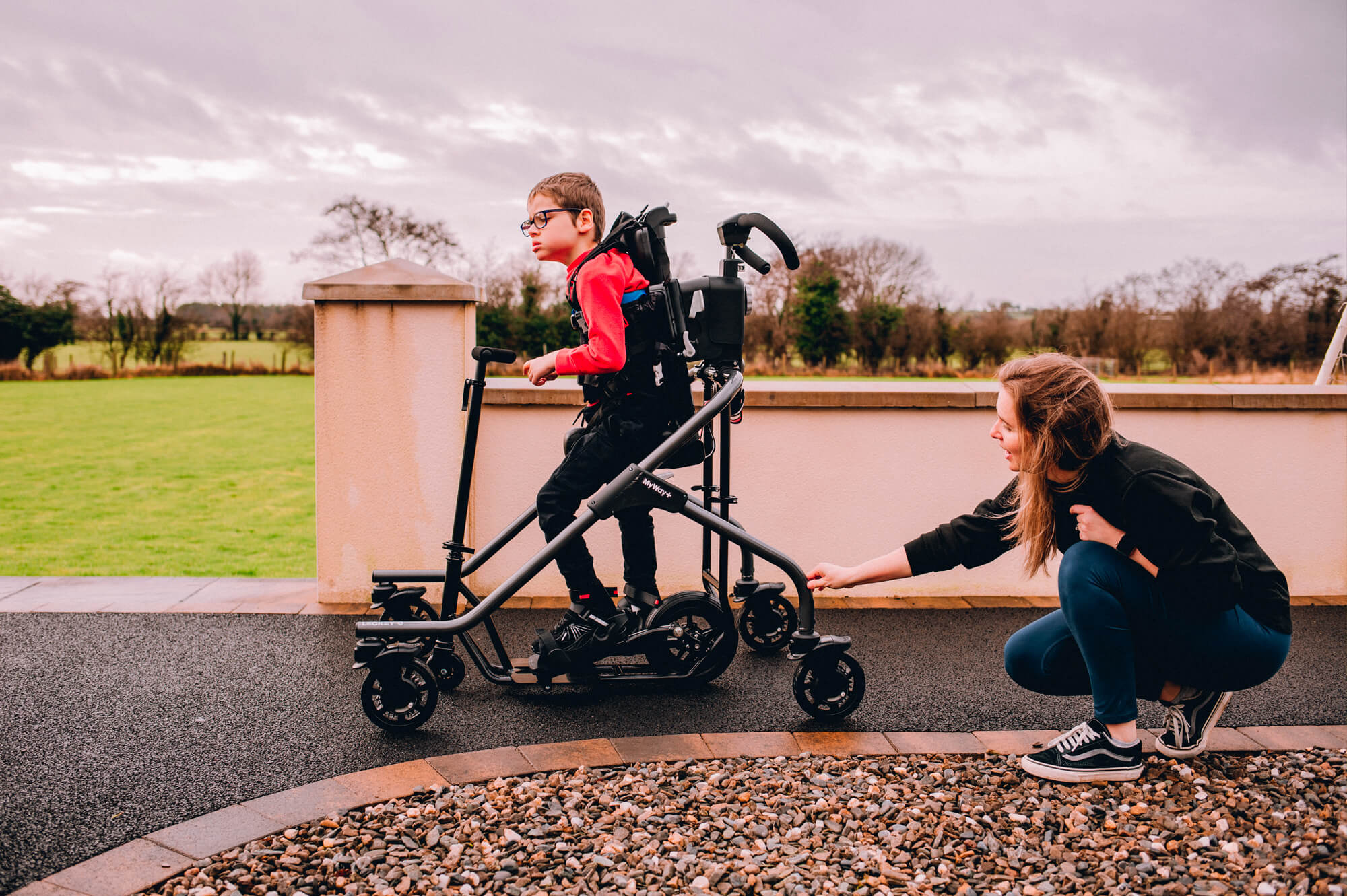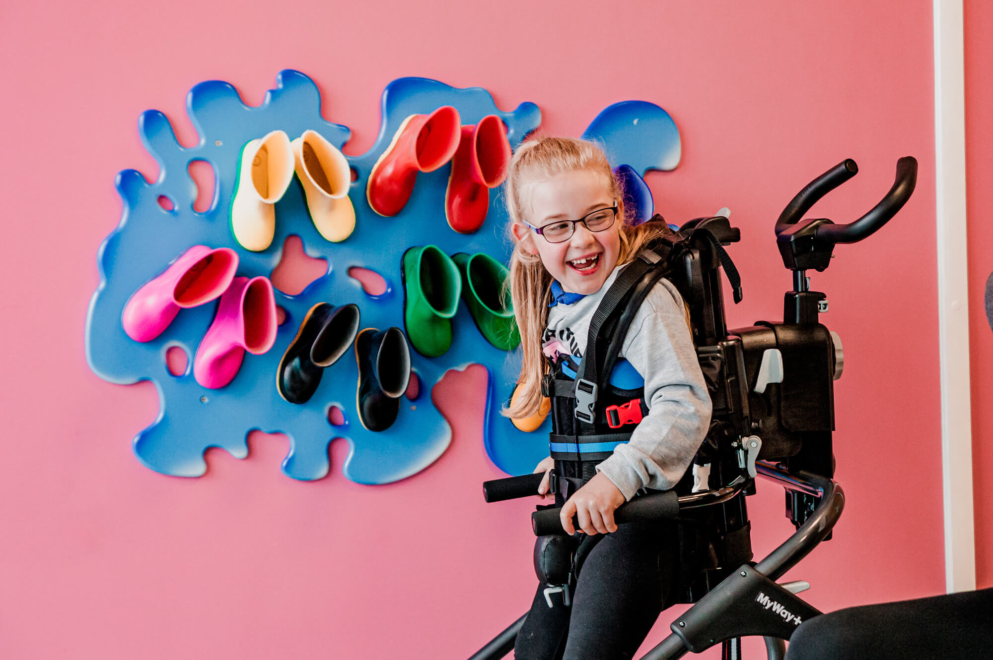 Kinder mit zusätzlichen Bedürfnissen haben oft eine schwächere Muskulatur, vor allem im Hüftbereich. Dies kann sich auf ihren Gang, ihre Funktion und die Entwicklung der Hüftgelenke auswirken. Die neue Side-Step-Funktion des MyWay+ arretiert die Rollen in einer seitlichen Position und bietet so die Möglichkeit, die Hüftabduktoren zu trainieren und zu stärken, während sie vollständig im Rahmen gehalten werden.