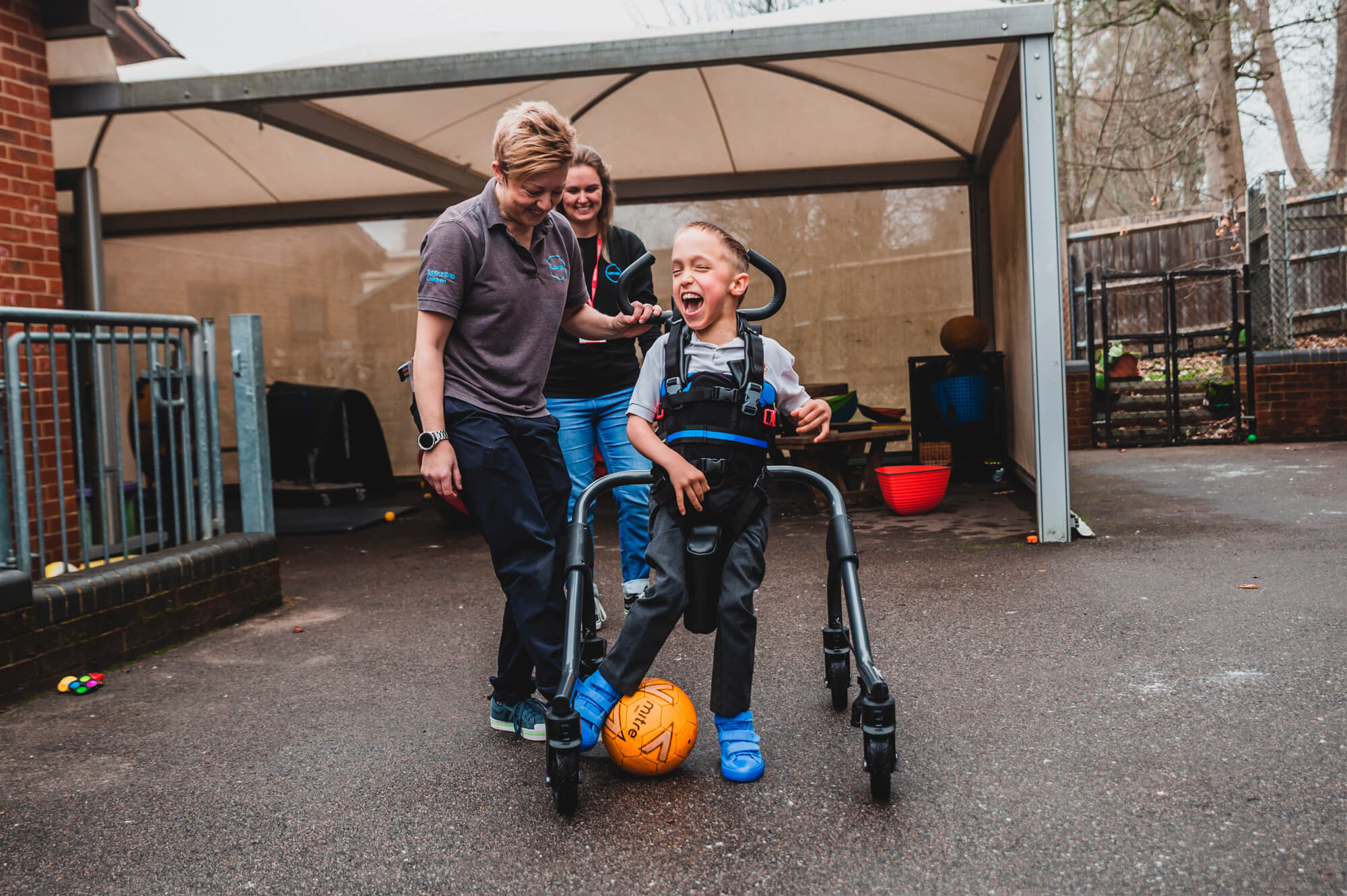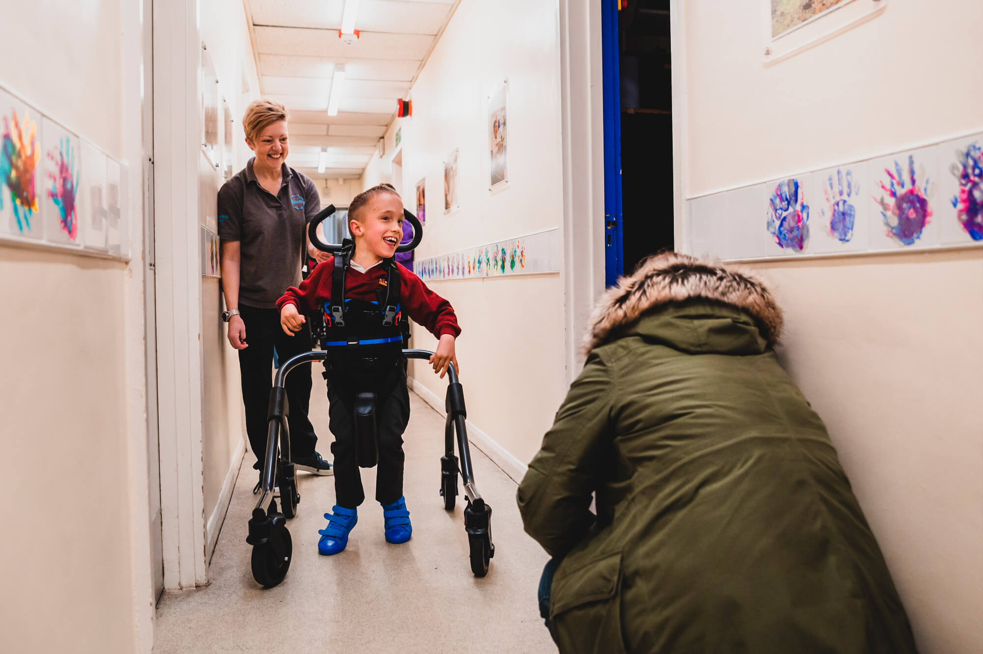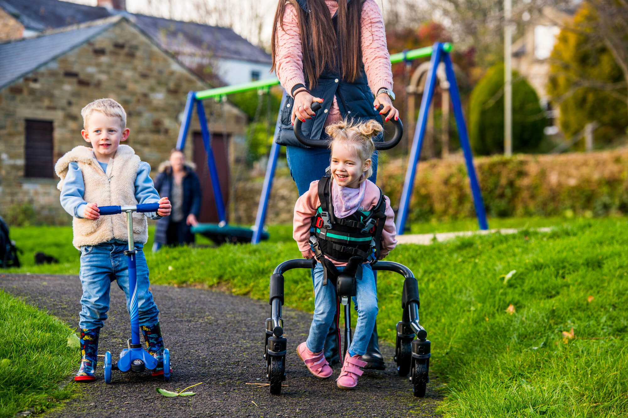 Kinder mit zusätzlichen Bedürfnissen haben oft eine schwächere Muskulatur, vor allem im Hüftbereich. Dies kann sich auf ihren Gang, ihre Funktion und die Entwicklung der Hüftgelenke auswirken. Die neue Side-Step-Funktion des MyWay+ arretiert die Rollen in einer seitlichen Position und bietet so die Möglichkeit, die Hüftabduktoren zu trainieren und zu stärken, während sie vollständig im Rahmen gehalten werden.